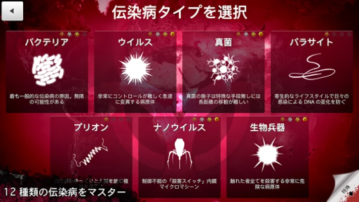 12種類のユニークな伝染病から選択し、それぞれ異なる戦略で世界を制覇しましょう。マインドコントロールを行う脳食い虫から、ゾンビを生み出すネクロアウイルスまで、想像を絶する脅威を操ることが可能です。さらに、世界規模のアウトブレイクを制御し、人類を救うことを目指す最新の拡張パックも登場。「Plague Inc. - 伝染病株式会社」は、数百に及ぶ病原体形質の進化、数千のグローバルイベント、そしてデイリーチャレンジや世界中のプレイヤーとの競争を通じて、終わりのない戦略的探求と興奮を提供します。